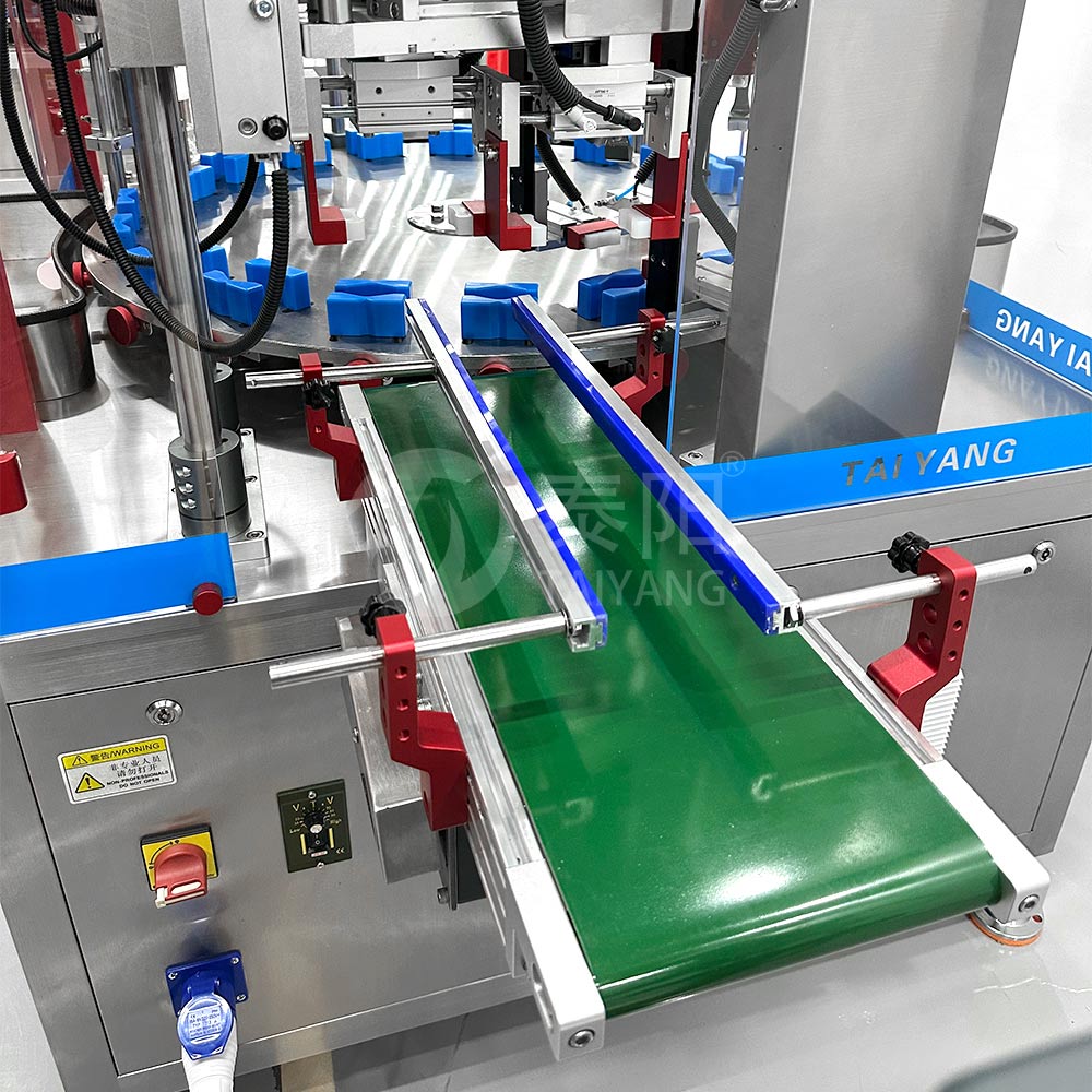 TAIYANG LOCATION CREMA MAILA ETA CAPPAPING MAKINA ZABALTZEKO PLATATZEKO 304 altzairu herdoilgaitza da, eta osagai pneumatiko guztiak Taiwan Airtac dira. Ukipen-pantaila da Weinview / Siemen L0-Inch-en. PLC PLC da Kontroladorea, GPG motorra eta schneiderrentzako aldagaia.